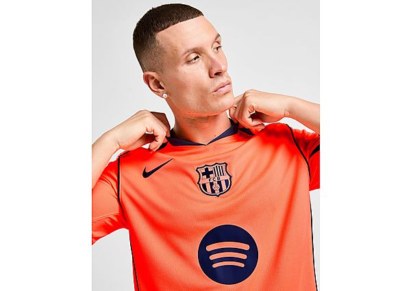 Classic Nike design meets the Spanish giants with this men's FC Barcelona 2025/26 Third Shirt. Dropping in Bright Crimson and Midnight Navy, this bold shirt uses the retro T90 template. A V-neckline, curved panels and a shoulder Swoosh combine with a central Barca badge. Made from lightweight polyester, it's finished off with sweat-wicking Dri-FIT tech. Machine washable.