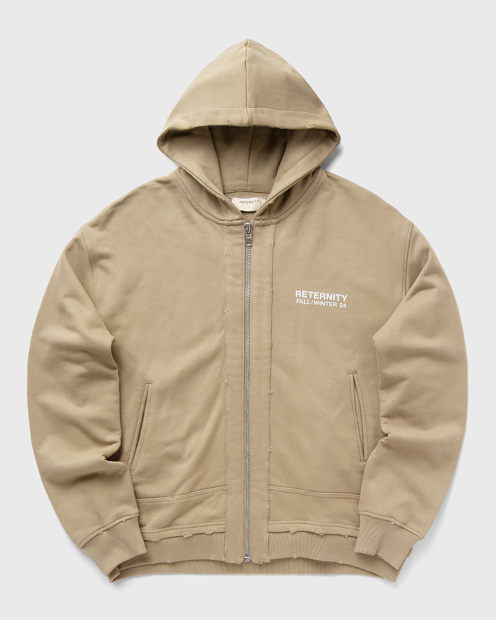 The RIBBED ZIP-HOODIE by Reternity has a vintage taupe wash and a logo print on the chest, complemented by numerous handcrafted destroyed effects for a unique vibe. A full-length zipper provides various styling options. - Full-length zipper - Vintage wash - Logo print on the chest