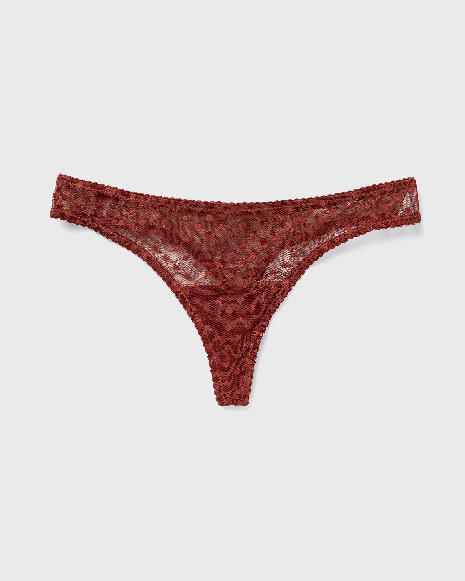 The Samse & Samse SAVIOLET STRING 15595 is a sheer mesh panty with a thong silhouette and embroidered heart pattern. - Elasticated seams and cuffs - Embroidered heart pattern - 100% cotton jersey insert