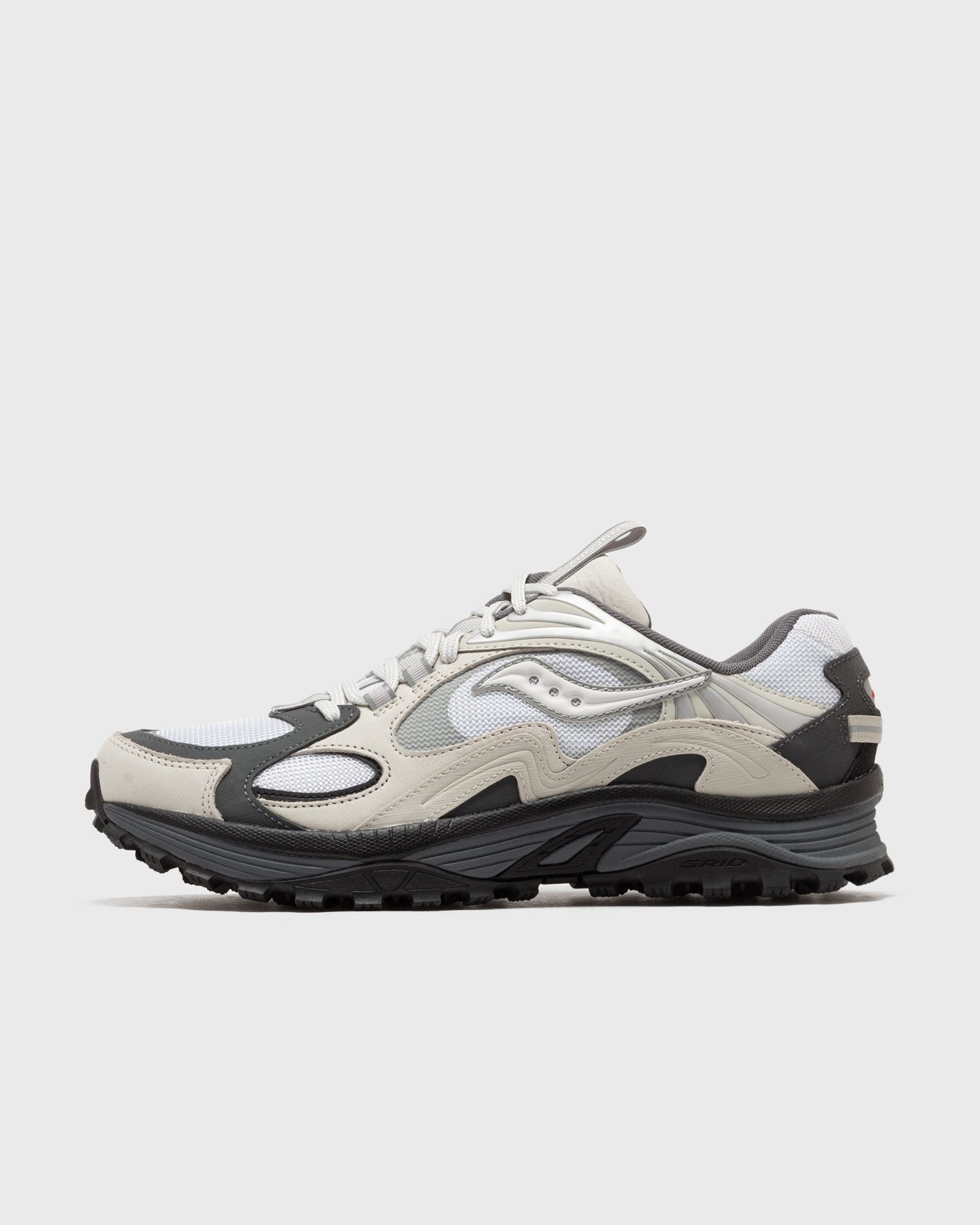 The Saucony Grid Aura X combines 00s trail design with modern technology. It has a breathable mesh upper with synthetic leather overlays. Metallic accents and logo applications on the sidewall pick up on the trail DNA, while Grid technology underfoot and a robust outsole with tread provide grip on any terrain.