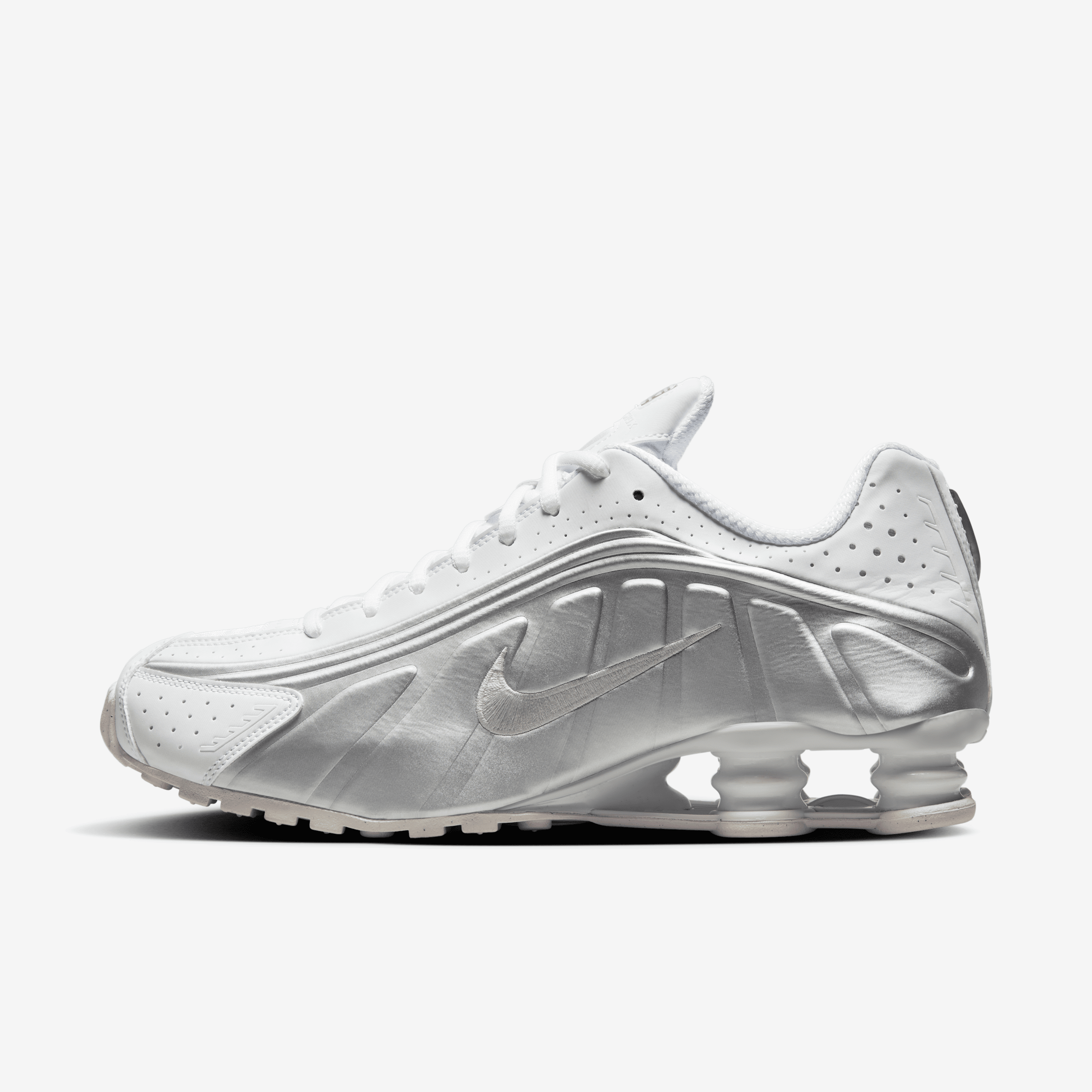 Los Nike Shox R4, una versión renovada del ícono de principios de los años 2000, replican el original con sus líneas de diseño futuristas y amortiguación de alto rendimiento. Las columnas Nike Shox en el talón distribuyen el peso para maximizar la comodidad, a la vez que proporcionan un look llamativo en la calle. ["Beneficios: La parte superior sintética y de tela es suave y duradera. La tecnología Nike Shox cuenta con columnas resistentes y flexibles que se comprimen y recuperan su forma para proporcionar una amortiguación excepcional. La suela tipo waffle circular modificada brinda gran tracción. Las perforaciones cortadas a láser mejoran la ventilación de punta a punta."] [] ["Datos del producto: Entresuela de espuma. Suela de goma. Este producto no está diseñado para usarse como equipo de protección personal (EPP)"] Style: HQ1988; Color: Blanco/Blanco/Carmesí brillante/Plata metalizado; Size: 8; Age Group: Adult | Nike Shox R4