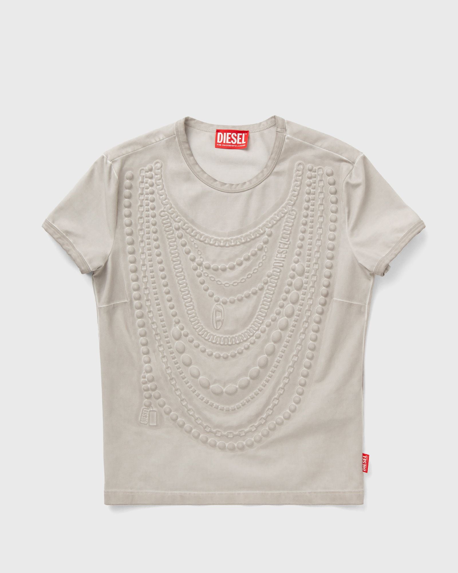 The Diesel T-Nekka T-shirt comes straight from the Spring Summer SS25 runway collection. It's made from tech stretch jersey and embossed with a high-frequency technique to create the effect of chunky necklaces across the chest. A pigment treatment gives the garment its washed-out gray tone. - Round neckline - Short sleeves