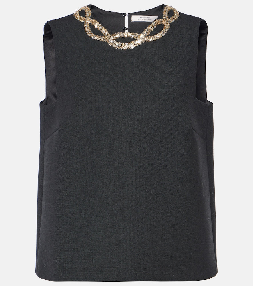 The Dorothee Schumacher Embellished top is expertly crafted using material: 53% polyester, 43% wool, 4% elastane. care instructions: dry clean. made in hungary. designer color name: pure black. lining: 100% polyester. closure: button fastening. — ensuring durability and an unmistakable touch of elegance. Its meticulous construction speaks to Dorothee Schumacher’s dedication to quality and distinctive design.