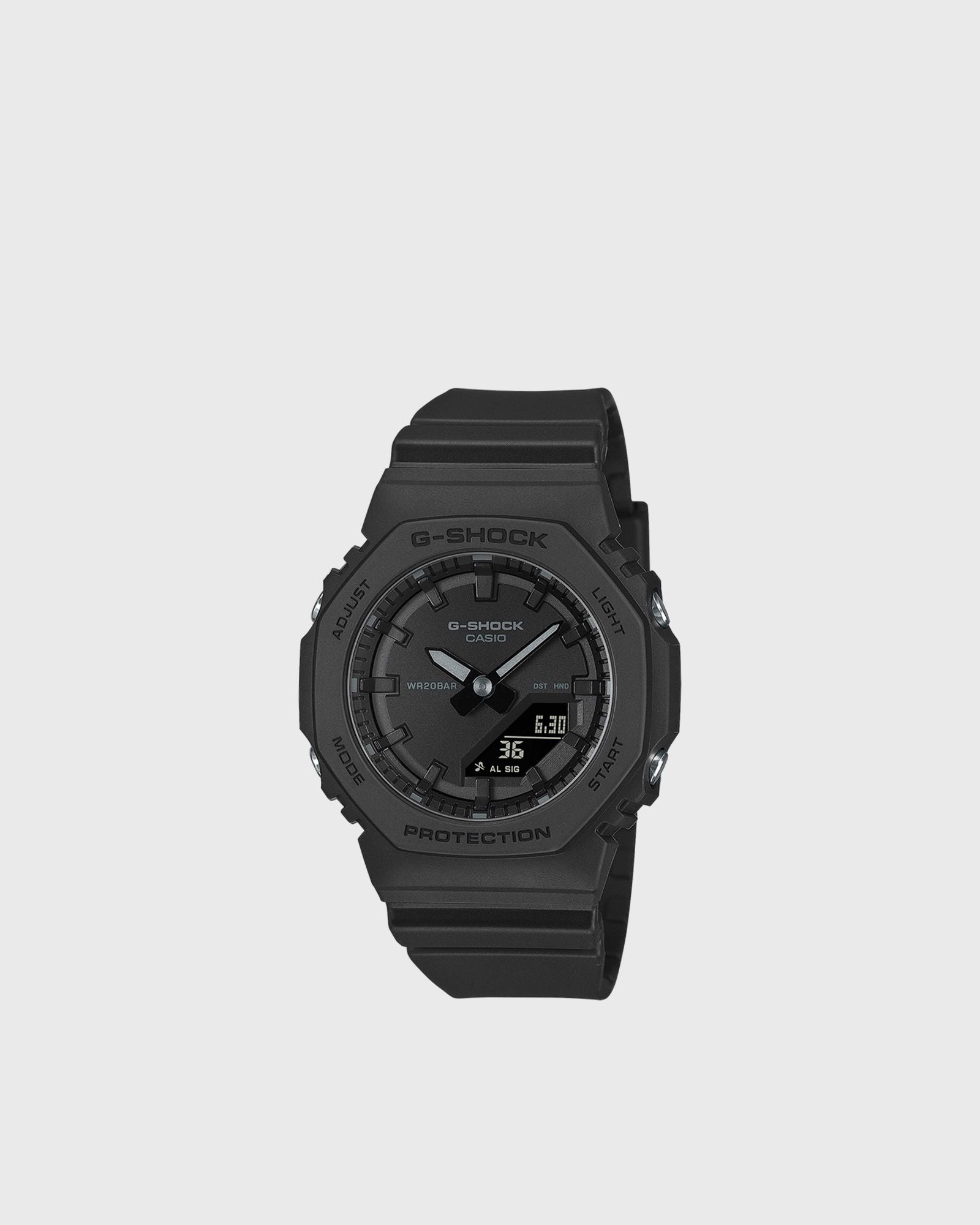 Street-smart and nature-conscious - the stylish G-SHOCK GMA-P2100BB-1AER comes completely in black. The monochrome design with a matt finish is simple yet striking. The main components of the bezel and strap are made of bio-based resin. This material is made from renewable organic resources and helps to protect the environment. - Case size: 46mm x 40.2mm x 11.2mm - Weight: 40g - Case and bezel material: Resin/bio-based resin - Strap: Bracelet made from bio-based resin - Water resistance: Water-resistant to 20 bar - Glass: Mineral glass
