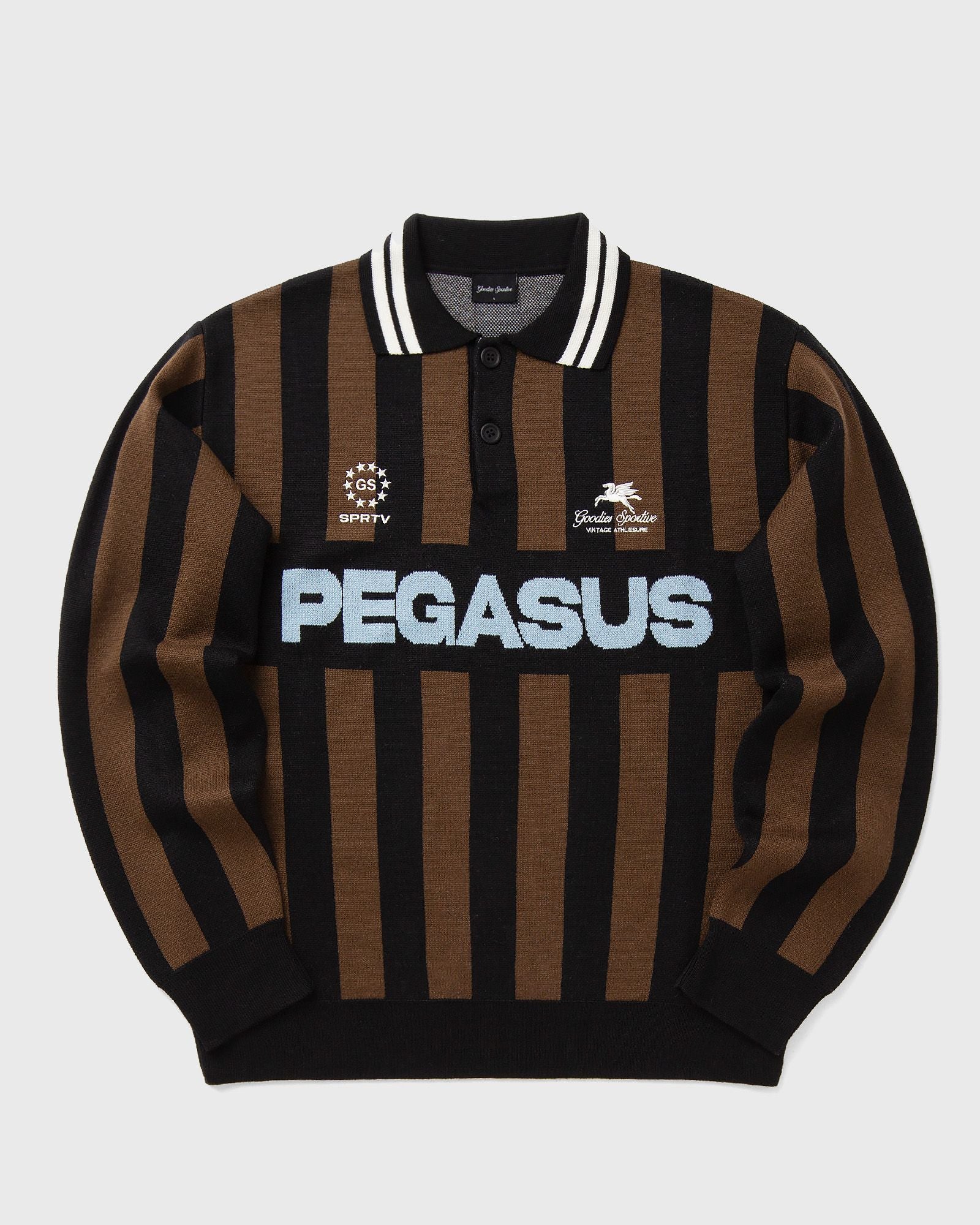 The Dachshund Polo by Goodies Sportive combines sporty retro charm with high-quality craftsmanship. The brown and black striped wool knit sweater with a classic polo collar and white Pegasus logo on the chest offers both comfort and style. - Polo collar with button placket - Ribbed cuffs and hem - Embroidered logo