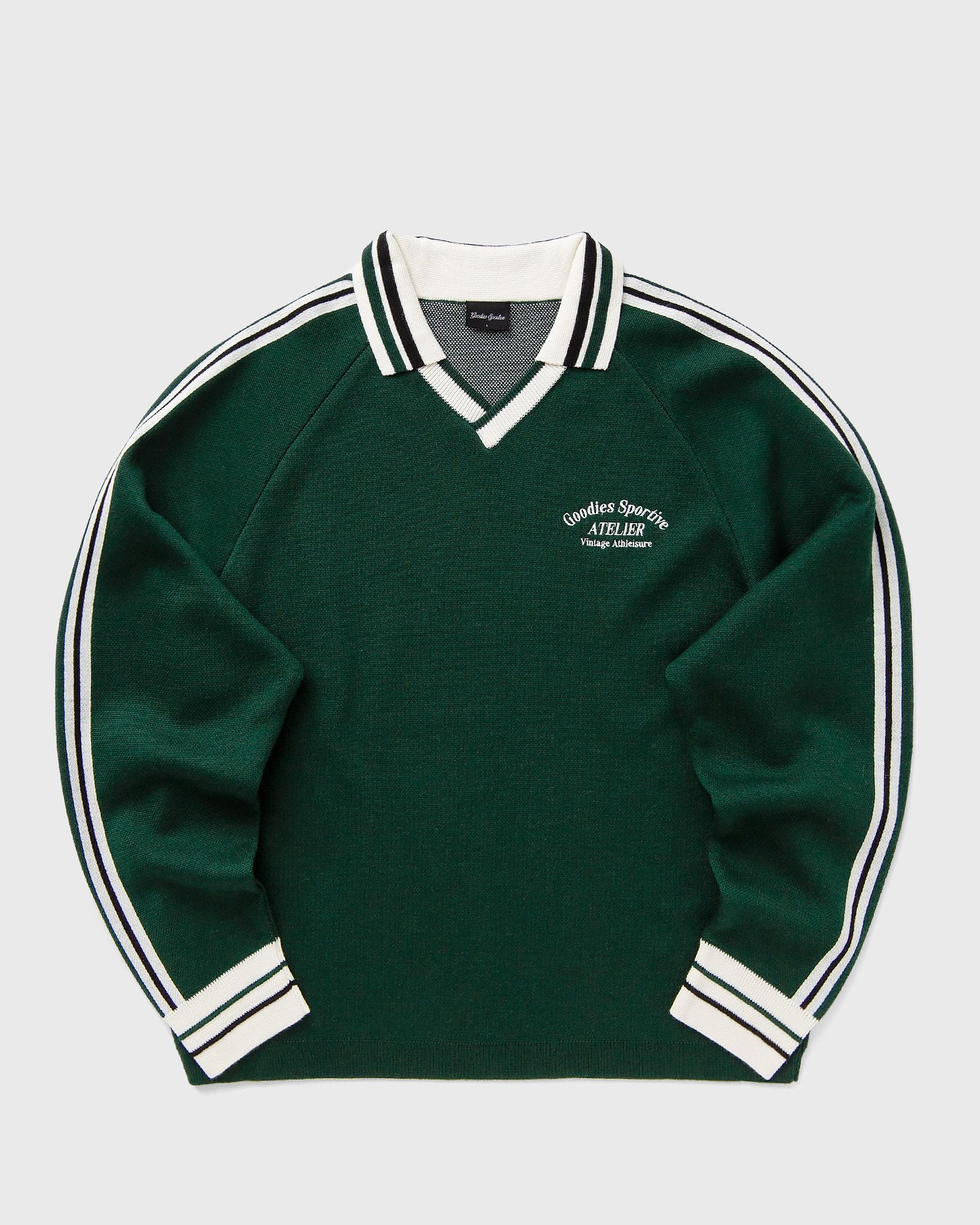 The Olive Polo from Goodies Sportive combines vintage charm with modern minimalism. In rich green with black stripes and an elegant V-neck, it adds casual sophistication to any look. - Long-sleeved knit polo shirt - V-neck - Made in Portugal