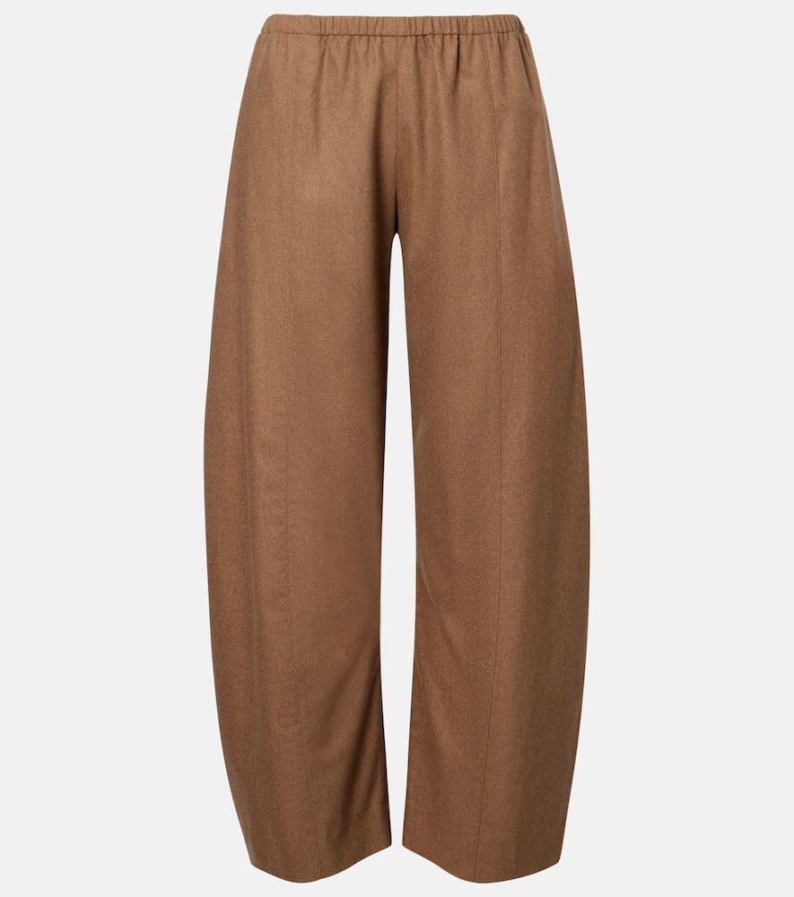 The Khaite Clover mid-rise wool barrel-leg pants is expertly crafted using material: 100% wool. care instructions: dry clean. made in italy. designer color name: toffee. item color: brown. elasticated waistband. pockets: side slit pockets. wool. — ensuring durability and an unmistakable touch of elegance. Its meticulous construction speaks to Khaite’s dedication to quality and distinctive design.