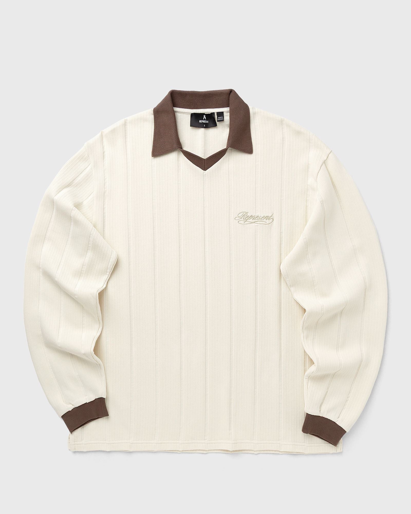 The Retro Football by Represent is a lightweight, long-sleeved top inspired by vintage sportswear silhouettes. Made from 100% cotton in a breathable 285gsm knit, it features a contrast ribbed collar and cuffs, tonal script embroidery and functional side slits. - 100% cotton, 285GSM lightweight knit construction - Contrast ribbed collar and cuffs - Tonal embroidery - Side slit detail - Relaxed fit, long sleeve silhouette