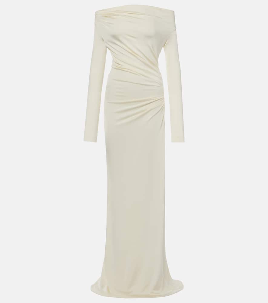 The Victoria Beckham Draped off-shoulder jersey gown is a refined outerwear essential, expertly made in Italy for elevated everyday wear. this luxury padded wool jacket reflects Victoria Beckham's commitment to timeless craftsmanship and modern functionality.