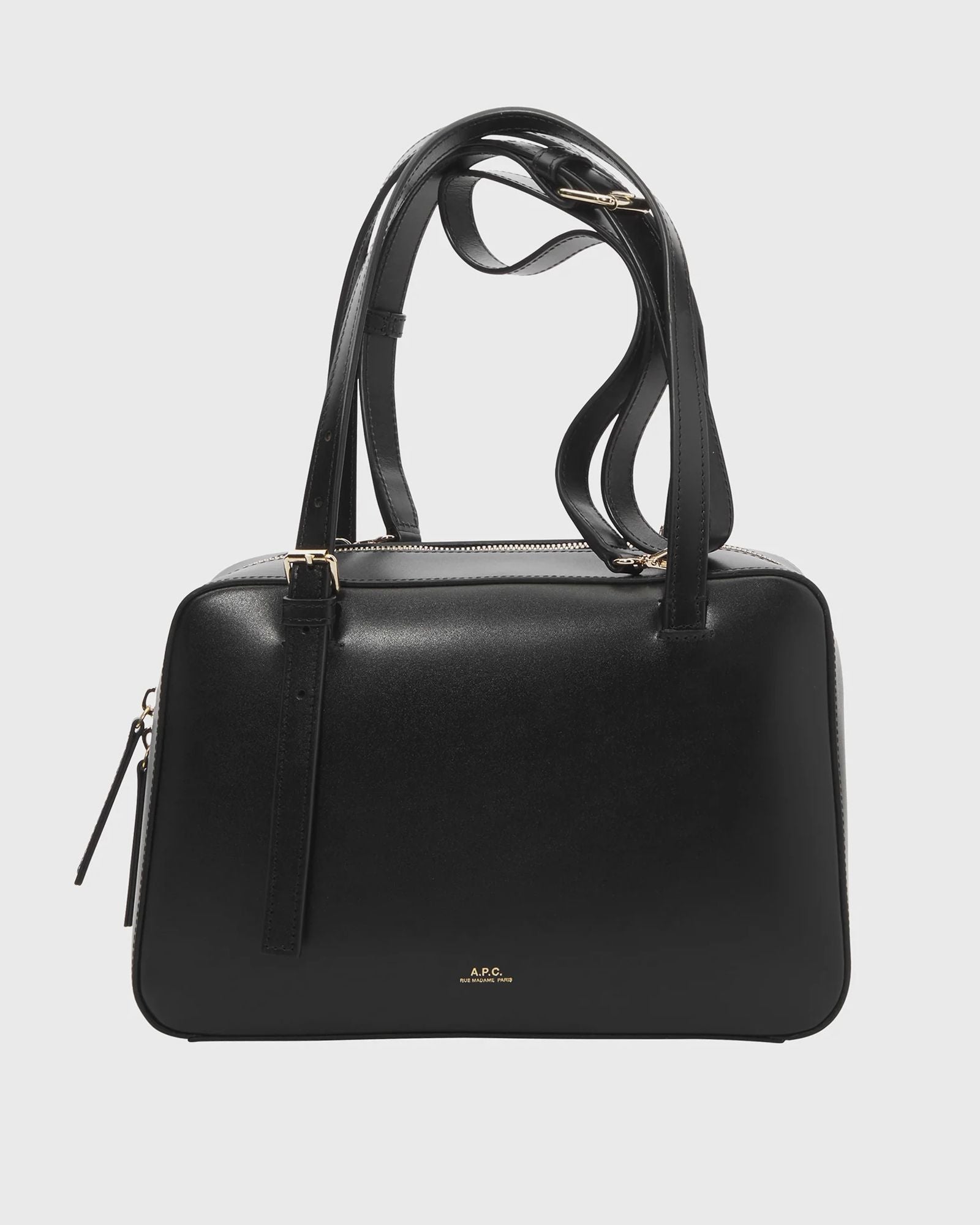 Virginie Box Bag by A.P.C. - Smooth leather bag - Two handles adjustable with gold-colored metal buckles to carry the bag in the hand or over the shoulder - The shoulder strap can be adjusted with a gold-colored metal buckle to carry the bag across the chest - Closes with two leather zippers - One inner compartment - Embossed gold-colored logo - Cotton lining - Dimensions: 28 x 18 x 10 cm