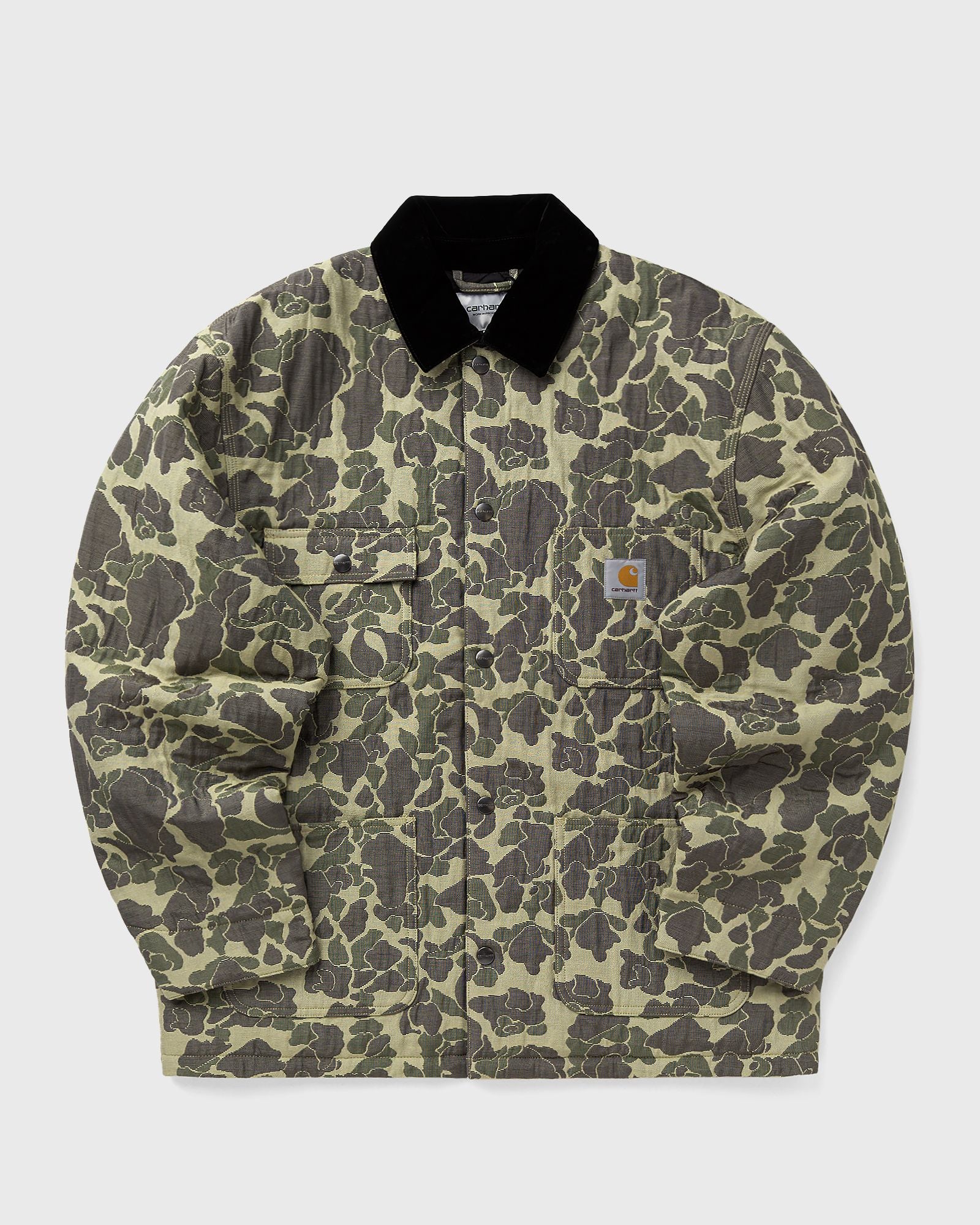 The Tapestry Chore Coat by Carhartt WIP is made from a medium-weight cotton blend with a camo jacquard pattern. It features a quilted lining for extra warmth. The style has four pockets on the front and a chest pocket on the inside. A woven square label completes the design. - Velvet collar - Double stitching - Buttons with logos - Four pockets, one flap with button - Adjustable cuffs - Inside chest pocket - Square label