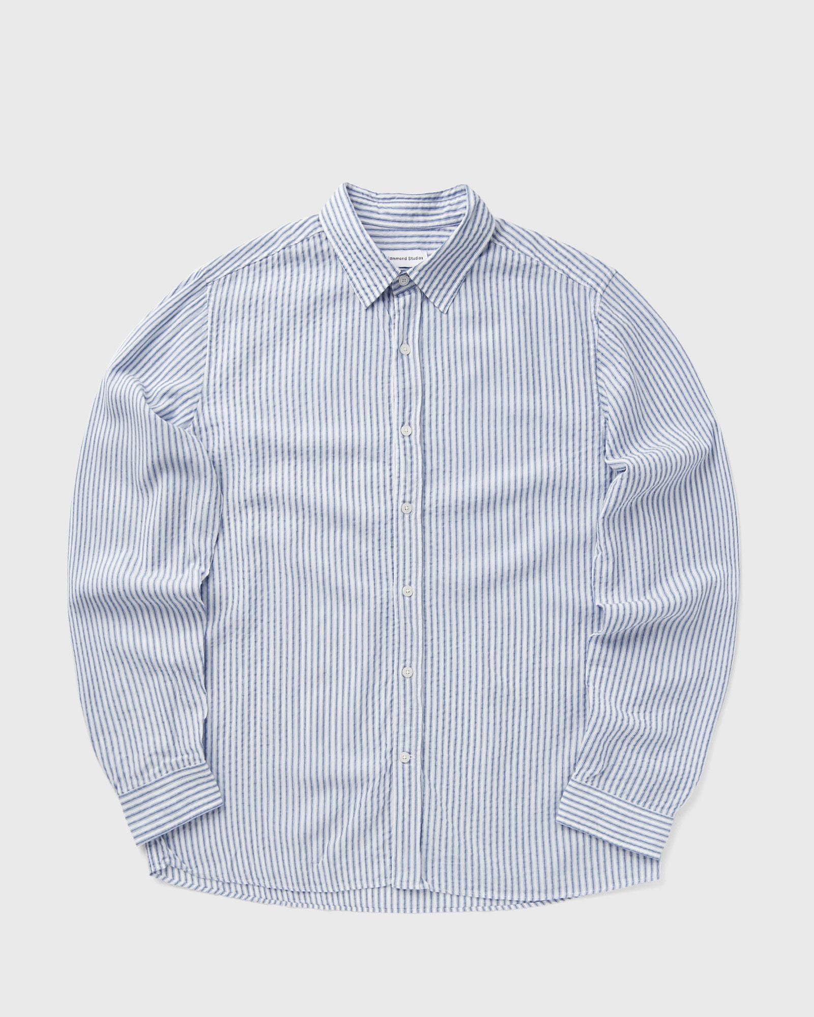 The Edmmond Studios THE LOBBY SHIRT is a relaxed addition to any summer closet. This navy blue striped piece made from seersucker material has a relaxed fit. - Button placket - Round cuffs