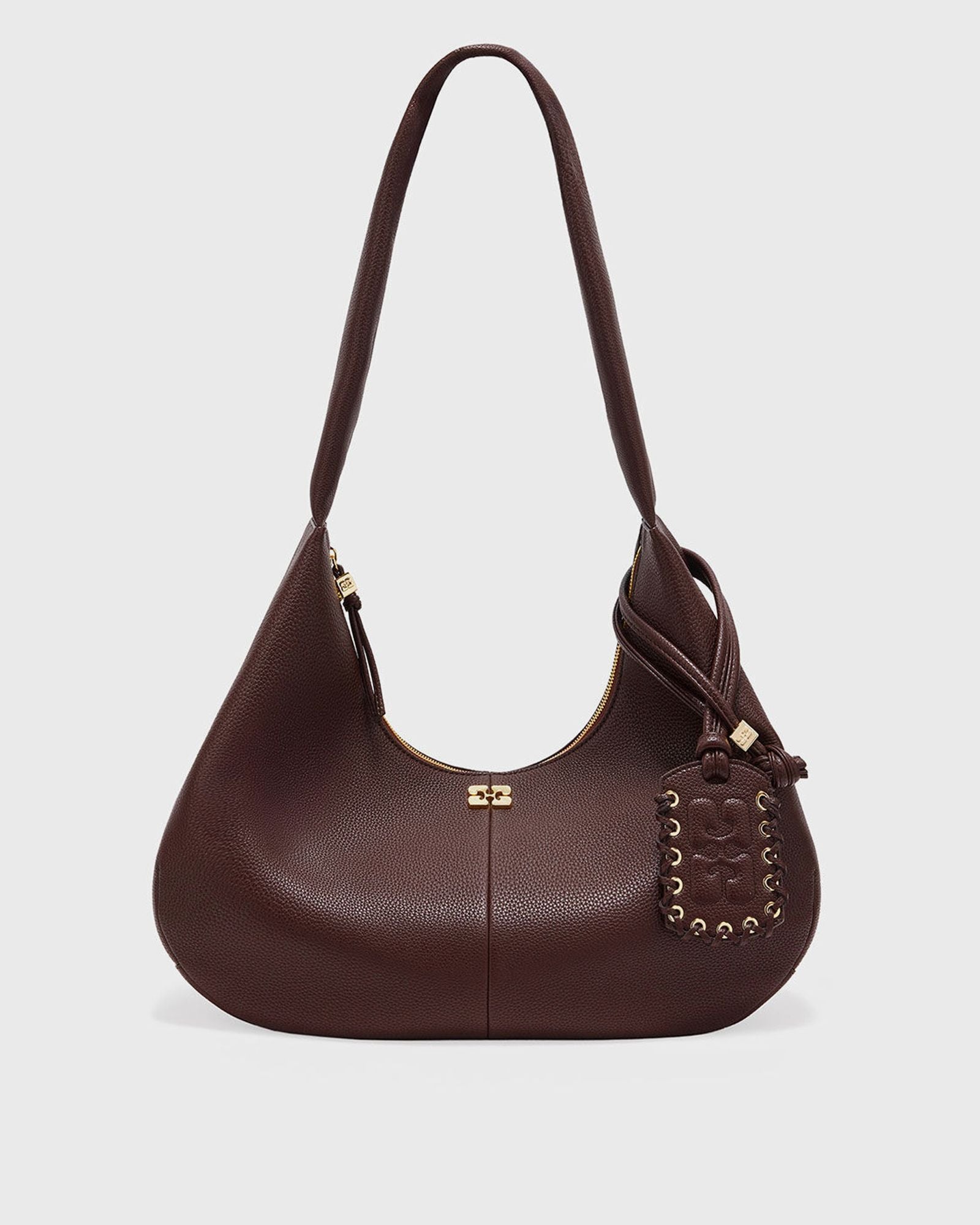 The Ganni hobo bag combines minimalist design with thoughtful details. With a shoulder strap, zipper closure, Ganni butterfly logo, and mirror charm, it is both functional and stylish. The interior has a compartment and an inner pocket with a zipper, ideal for storing essentials. - Grainy texture - Shoulder strap - Zipper - Ganni butterfly logo - Metal cube with engraved Ganni and butterfly logo - Embossed Ganni logo on the back of the bag - Mirror charm - Zippered inner pocket - Dimensions: 43 x 29 x 15 cm