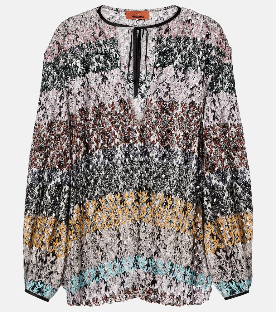 Material: 92% viscose, 8% metallic fibres. Care instructions: dry clean. Made in Italy. Designer color name: Multicolor Tones. Item color: multicolor. Collar: V-neck. Self-tie neck. Self-tie cuffs.