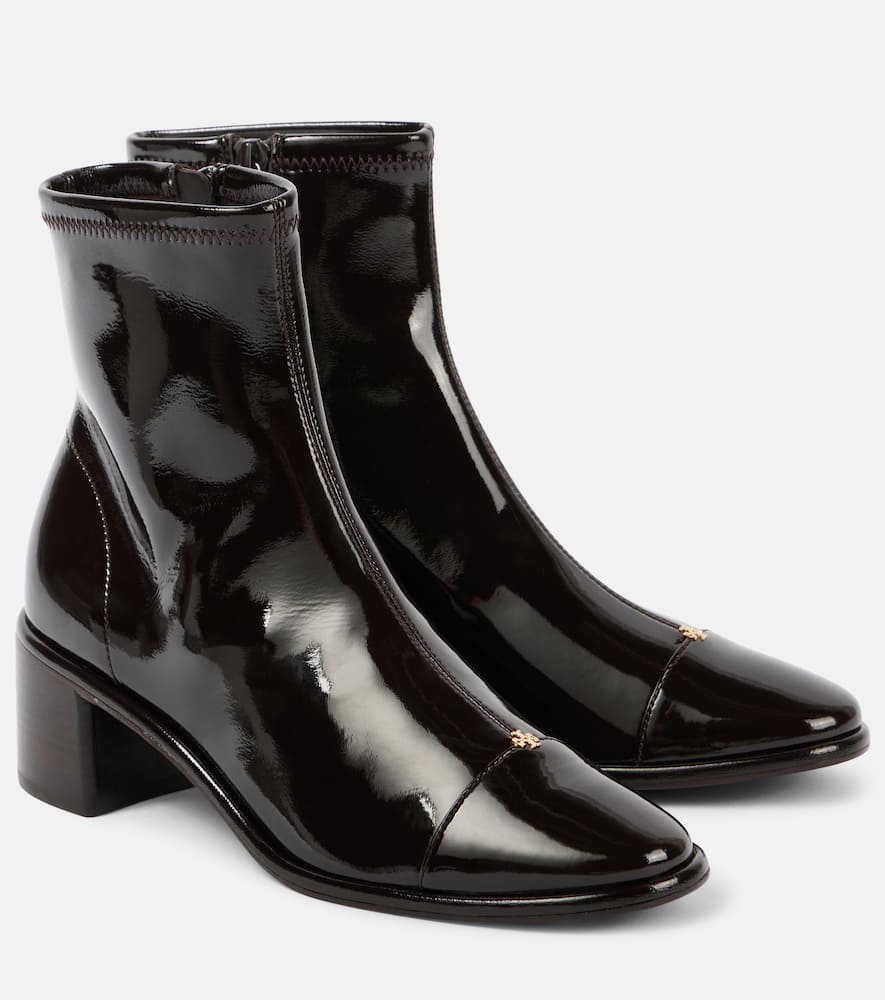 The Tory Burch Patent leather ankle boots is expertly crafted using upper: leather. lining: leather. sole: leather insole, leather and rubber sole. toe shape: almond toe. made in vietnam. includes: shoe box, dust bag. designer color name: cacoa. closure: zipped side. — ensuring durability and an unmistakable touch of elegance. Its meticulous construction speaks to Tory Burch’s dedication to quality and distinctive design.